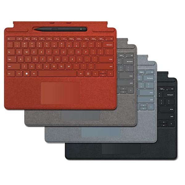 پیش از اینکه مدل فلکس به بازار معرفی شود، کیبورد سیگنیچر را باید به عنوان آخرین محصول ساخته شده توسط مایکروسافت، معرفی کنیم. در طراحی سیگنیچر، شرکت مایکروسافت از پارچه های سازگار با رنگ سرفیس پرو استفاده کرده که جنس اصلی آن ها آلکانترا است و به همین دلیل محبوبیت آن ها بیش از هر لوازم جابنی عنوان شده. این کیبورد از بلوتوث نسخه 5.0 برای اتصال پایدار و مصرف انرژی کم استفاده می کند و باتری لیتیوم یونی آن تا 3 ماه دوام می آورد. کلیدهای با نور پس زمینه و فاصله مناسب، تایپی سریع و دقیق را ایجاد می کنند و تاچ پد یکپارچه از ژستهای حرکتی ویندوز پشتیبانی می کند. همچنین، سازگاری بالا با دستگاههای سرفیس و ویندوز 10 به بالا، به همراه پورت شارژ USB-C و امکان اتصال به چند دستگاه، این کیبورد را به انتخابی عالی تبدیل کرده است.